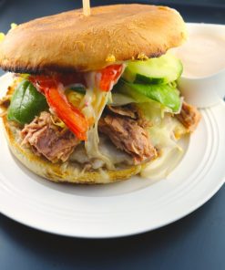 Saftige Tomaten, Gewürzgurken und Käse auf saftigem, gegrilltem Rindfleisch mit Schnittsalat und hausgemachter Burgersauce.
