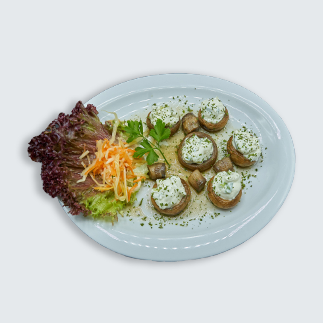 leckere gegrillte Champignons mit Tzatziki(G) garniert.