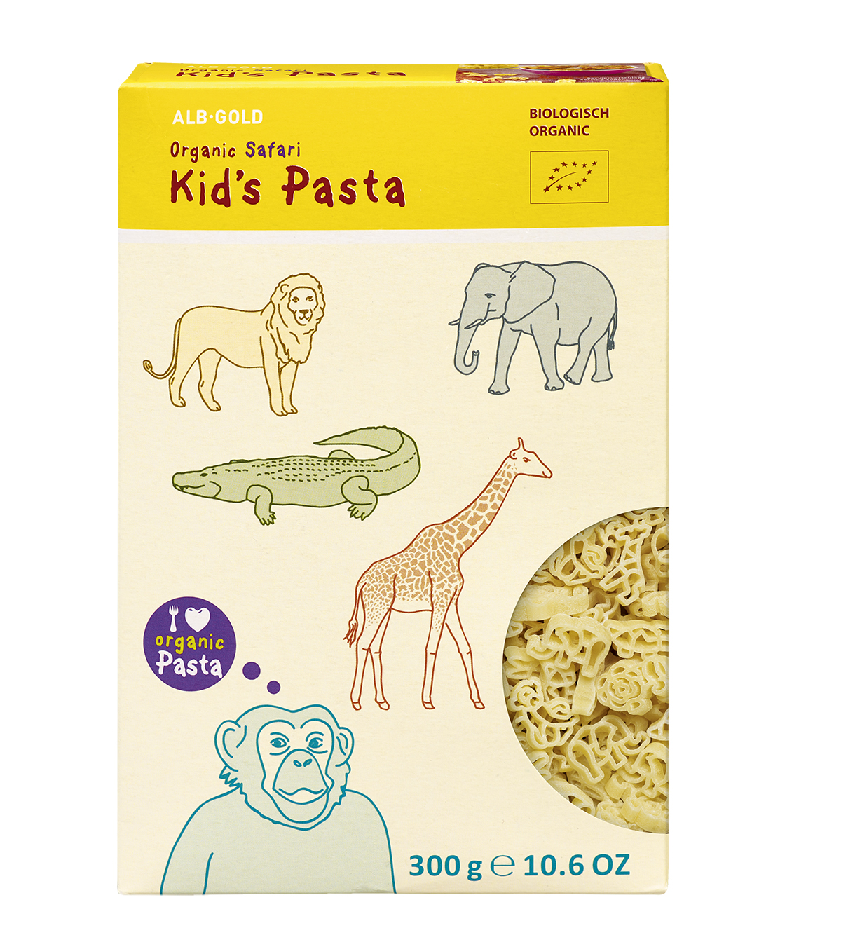 Gehen Sie auf „Safari“. Die ALB-GOLD Kids-Pasta wird aus biologisch angebautem Hartweizengrieß, ohne Zugabe von Eiern, hergestellt. In der bunt bedruckten Kartonage tummeln sich die zahmen Nudelausformungen: Giraffe, Krokodil, Löwe, Elefant und Affe.