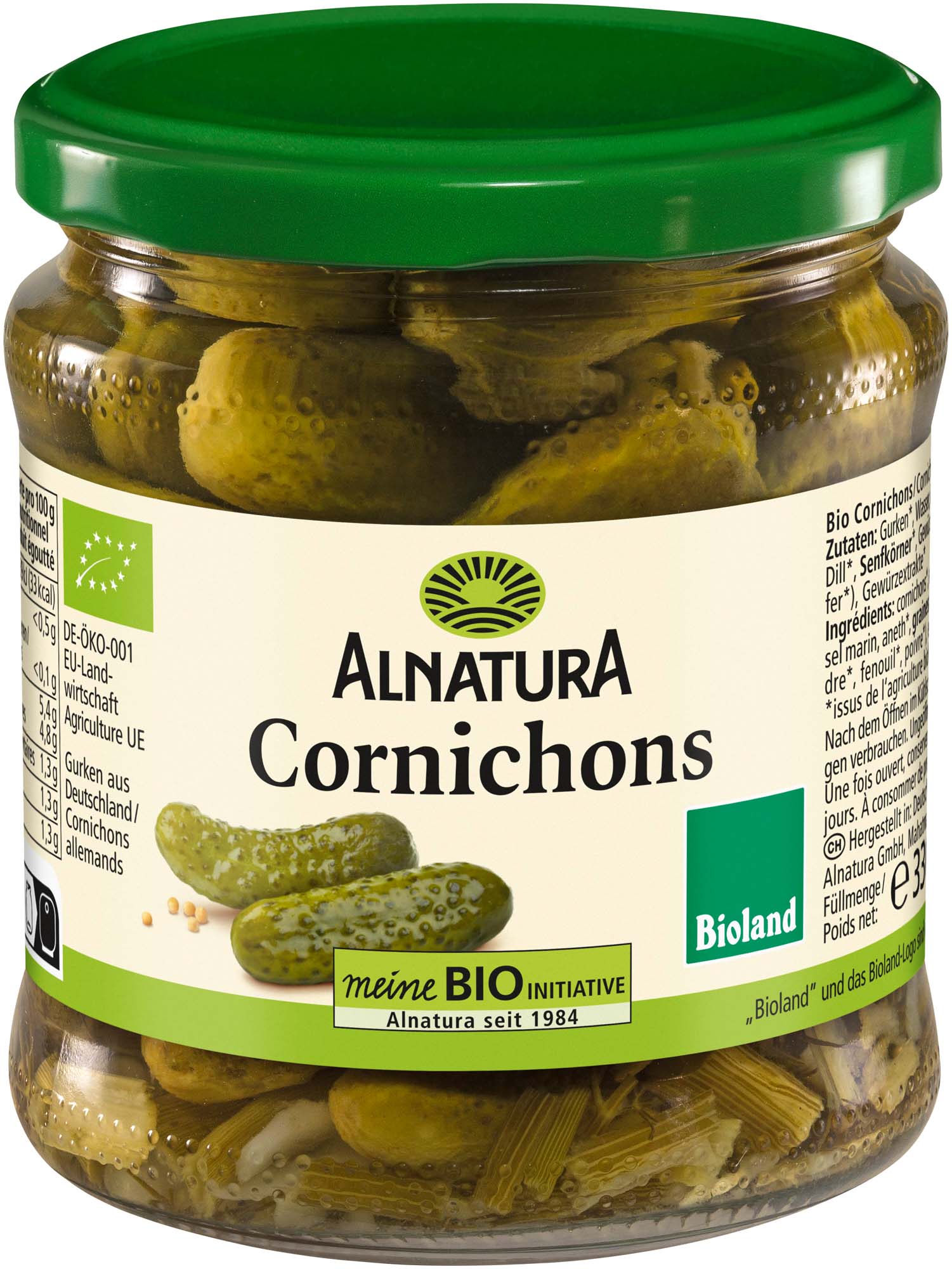 Das Wort Cornichons stammt aus dem Französischen und steht für kleine, knackige Gürkchen. Die Alnatura Cornichons werden in Deutschland nach Bioland-Richtlinien angebaut und verarbeitet. Sie sind süß-sauer eingelegt und durch die Zugabe von Gewürzen aromatisch verfeinert. So schmecken die Bio-Cornichons zum Brot, im Salat oder auch einfach mal zwischendurch.