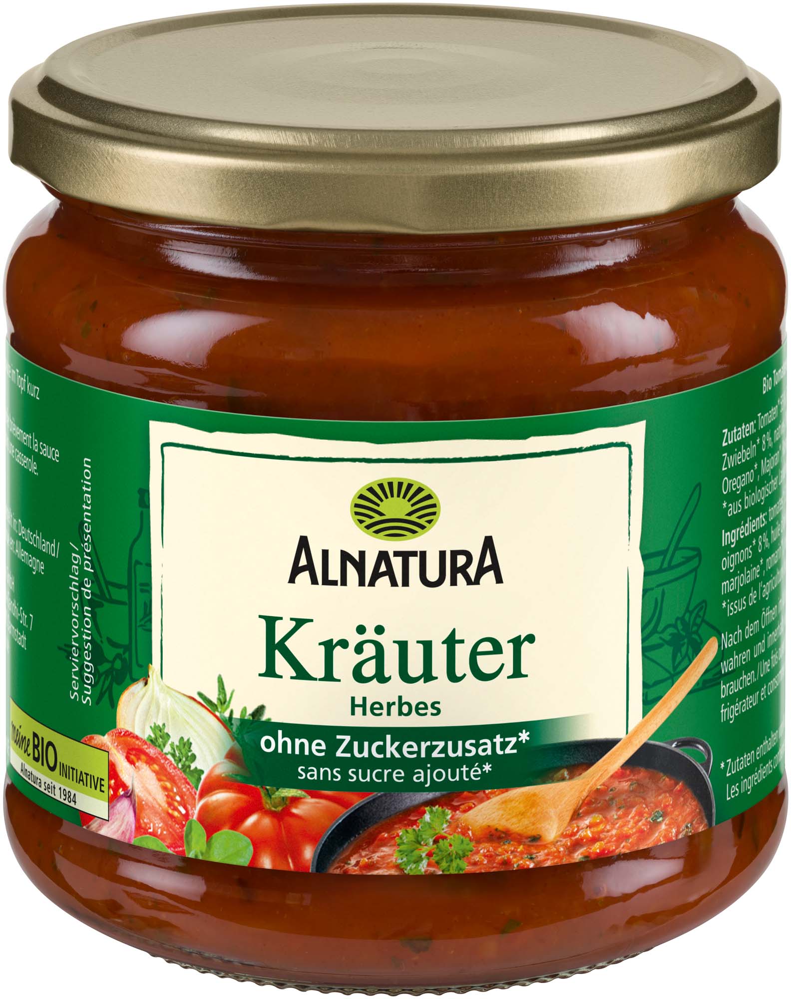 Eine frisch-fruchtige Bio-Tomatensauce, die mit aromatischen Kräutern wie Petersilie, Thymian und Oregano harmonisch abgerundet ist. Auf Zusatz von Zucker wird in der Rezeptur verzichtet (Zutaten enthalten von Natur aus Zucker). Die Alnatura Tomatensauce Kräuter muss vor dem Genuss lediglich kurz erhitzt werden – ideal für die schnelle genussvolle Küche. Mit Sahne, Ricotta oder Crème fraîche lässt sie sich raffiniert verfeinern.