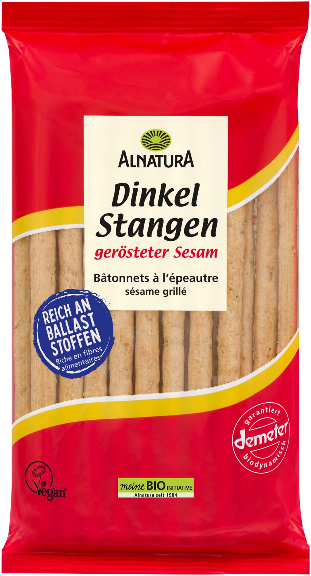 Ein feinaromatisches Bio-Knabbergebäck: Diese Dinkel-Stangen in Demeter-Qualität sind knusprig gebacken und mit geröstetem Sesam bestreut. Die Alnatura Dinkel-Stangen schmecken pur oder mit Dip serviert. Sie enthalten 40 Prozent Dinkelvollkornmehl, sind reich an Ballaststoffen und vegan.