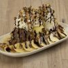Banane, 3 Kugeln Vanille-, Schoko- und Stracciatella-Eis, Sahne, Schoko-Sauce und -Raspel, Batida de Coco, Raffaello-Kugeln NUOIAEKF