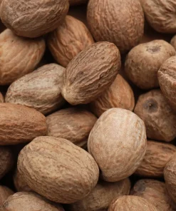 Die braunen Muskatnüsse haben eine ovale Form und eine Schale die durch ihre leichte Strukturierung an eine feine Holoberfläche erinnert.
