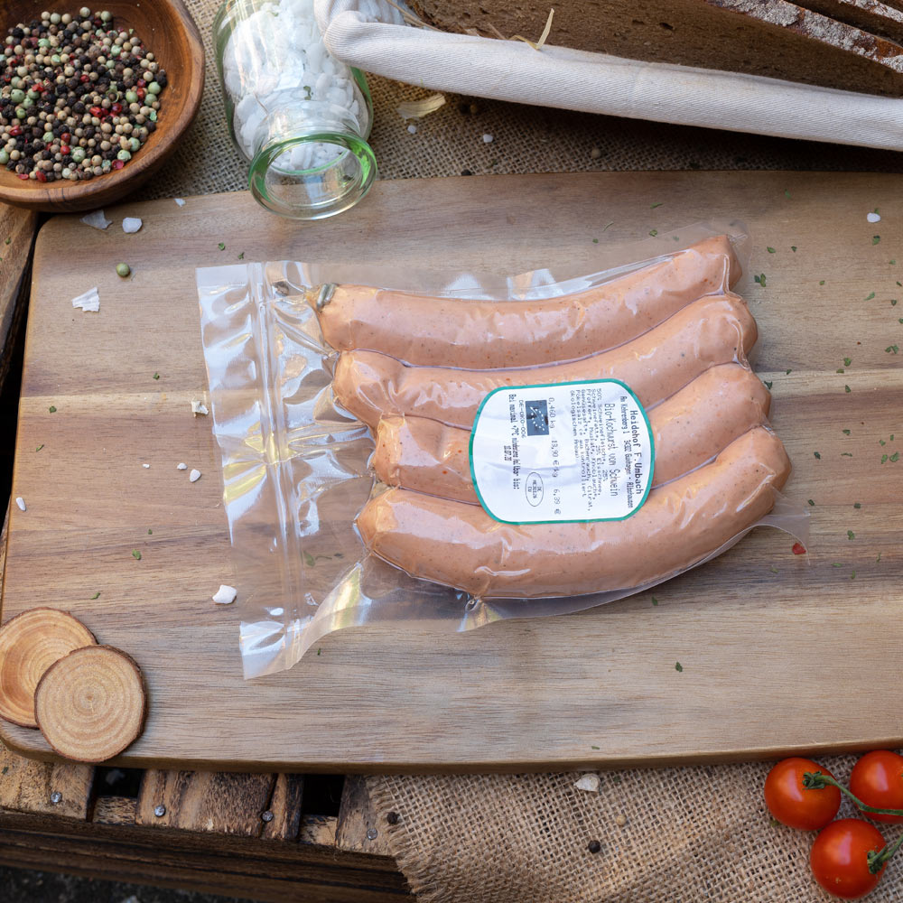 50% Schweinefleisch, 25% Schweinefett, 25% Eisschnee, Pfeffer, Muskat, Knoblauch, Gemüsesaft, Buchenrauch, Citrat, Pökelsalz