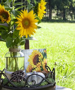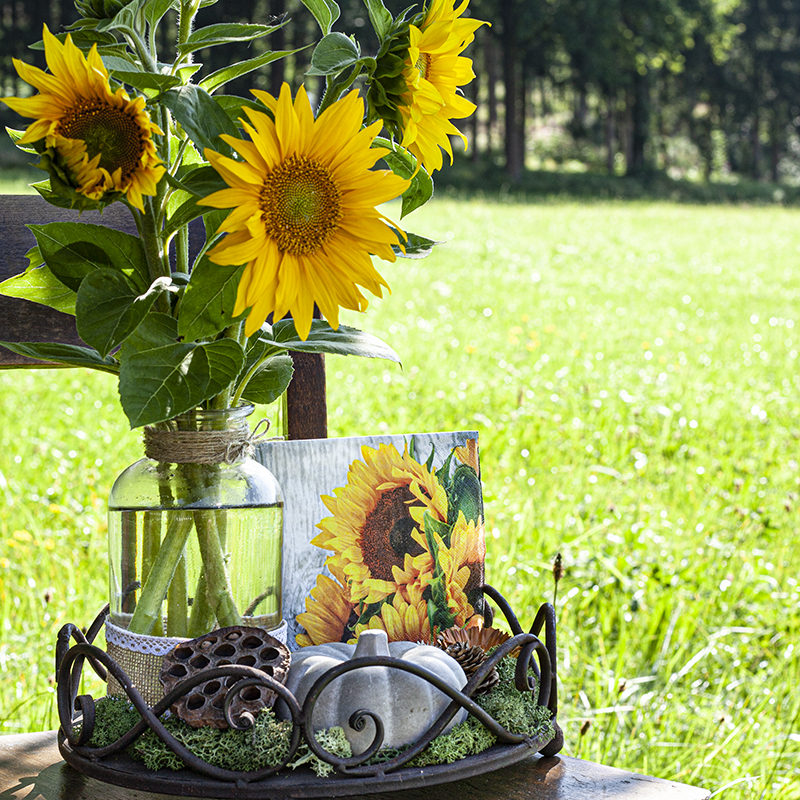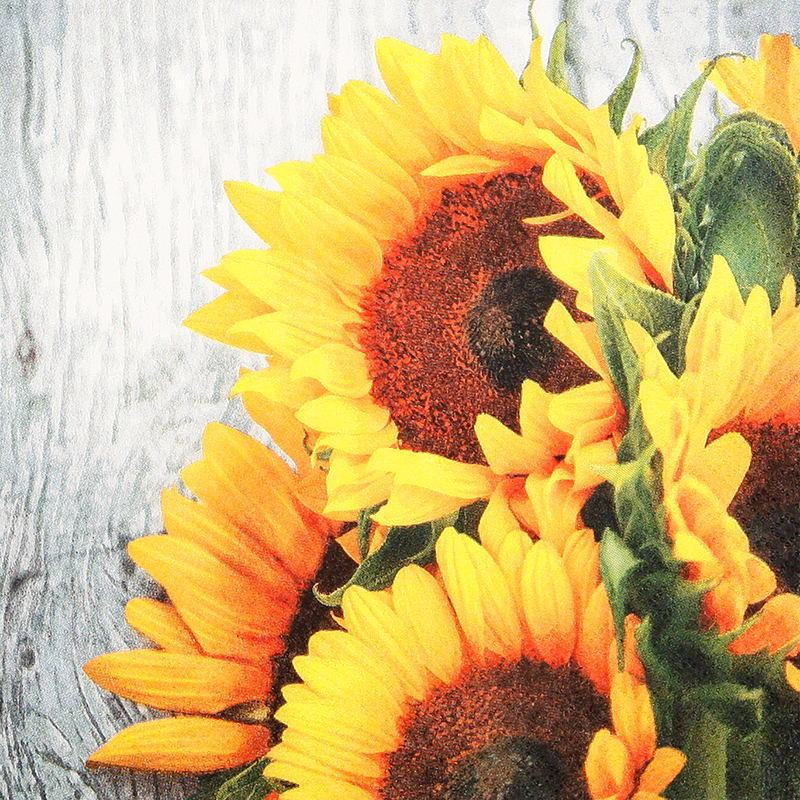 Hochwertige 3-lagige Servietten mit Sonnenblumenmotiv und rustikalem Charme.