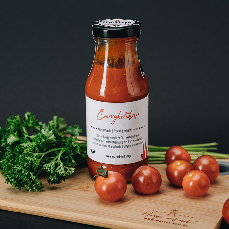Zutaten: Tomaten (75%), Zwiebeln, Tafelessig (Branntweinessig, Würze, natürliches Aroma, Hefeextrakt), Zucker, Speisesalz, Gewürze, Currypulver (0,24%) (enthält Senfmehl), Senf (Wasser, Senfsaat, Branntweinessig, Salz, Zucker, Gewürze, Karamellzuckersirup), Verdickungsmittel Guarkernmehl.