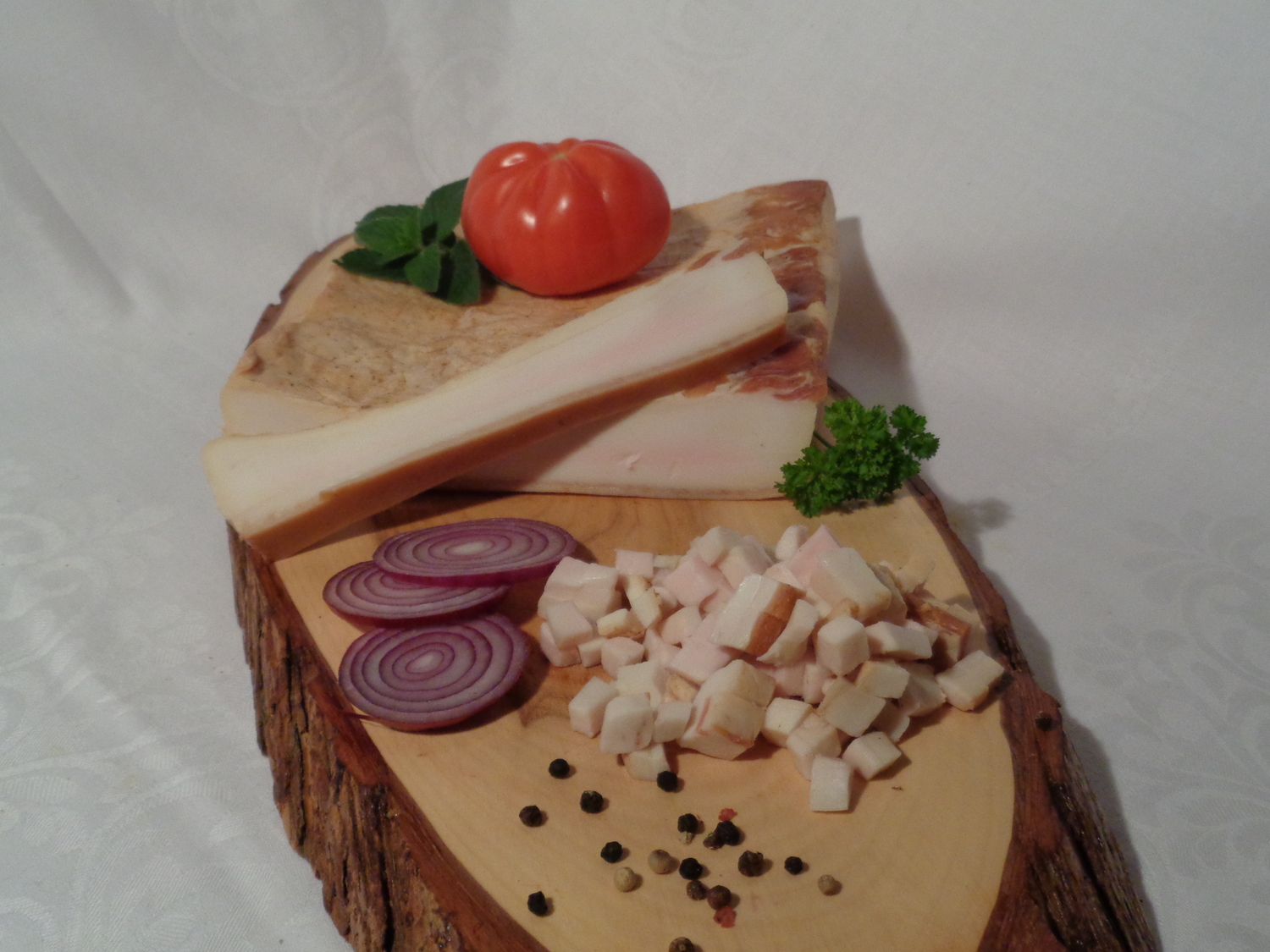 Grüner Speck gesalzen und durch räuchern haltbar gemacht.