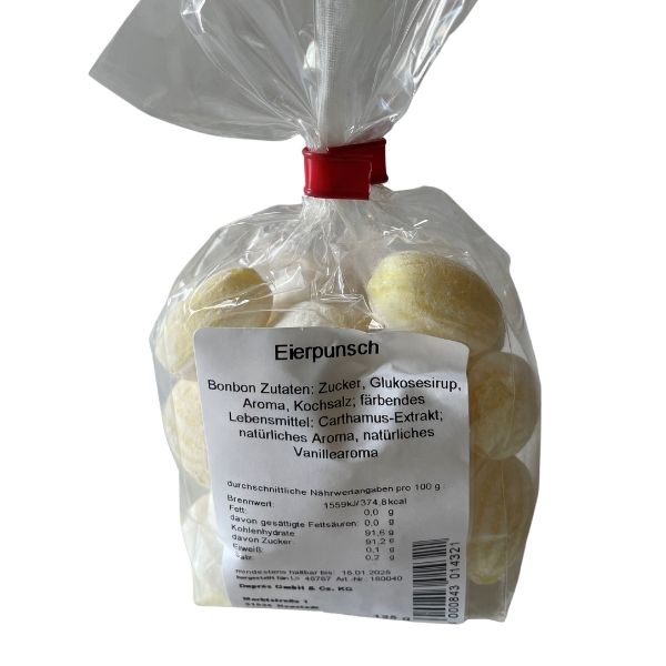 Eierpunsch Bonbons – eine einmalig köstliche, klassische Leckerei! Jede 125g-Packung enthält Bonbons mit einem Geschmack, der Sie an Omas hausgemachten Eierlikör erinnert. Genießen Sie diese traditionelle Süßigkeit für die Weihnachtszeit zu jeder Zeit des Jahres für einen festlichen Genuss wie keinen anderen. Mit den Eierlikör-Bonbons von Duprès ist wirklich für jeden Geschmack etwas dabei – und obendrauf das perfekte Geschenk für jeden Anlass!
