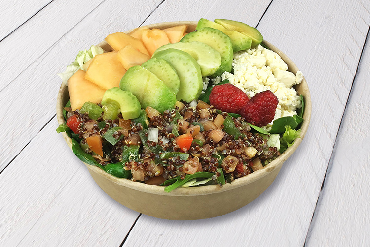 Mit Avocado, Spinat, Quinoa, Feta-Käse, Edamame Bohnen, Cantaloupe Melone, Himbeeren. Auf Wunsch liefern wir Ihnen gerne frisches Baguettebrot und Servietten dazu. Bitte geben Sie uns einen entsprechenden Hinweis im Feld Bemerkungen am Ende der Bestellung.