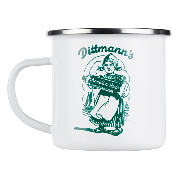 Jetzt neu und nur für kurze Zeit im Sortiment: die Emaille Tasse mit dem allerersten Feinkost Dittmann Motiv. Die Tasse zeigt auf der einen Seite das “Dittmann’s Sardellenmädchen” und auf der anderen Seite das Feinkost Dittmann 120 Jahre Logo.