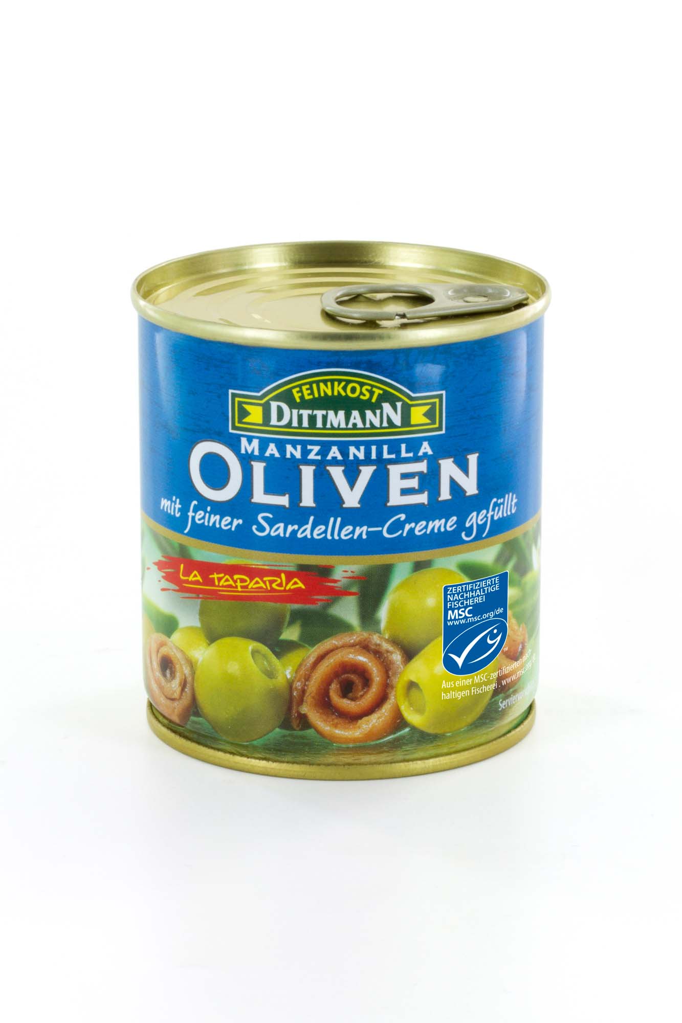 Feinkost Dittmann Manzanilla-Oliven mit feiner Sardellencreme gefüllt 200g