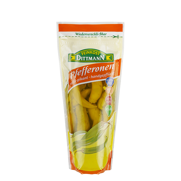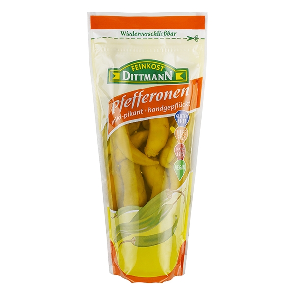 Eine Bereicherung für Ihre Gerichte: Die mild-pikant eingelegten Pfefferonen von Feinkost Dittmann eignen sich hervorragend für mediterrane Salate wie griechischen Bauernsalat oder Krautsalat, als Antipasti und für Aufläufe. Pur genossen sind sie eine Delikatesse.