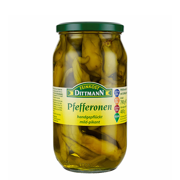 Eine Bereicherung für Ihre Gerichte: Die mild-pikant eingelegten Pfefferonen von Feinkost Dittmann eignen sich hervorragend für mediterrane Salate wie griechischen Bauernsalat oder Krautsalat, als Antipasti und für Aufläufe. Pur genossen sind sie eine Delikatesse.