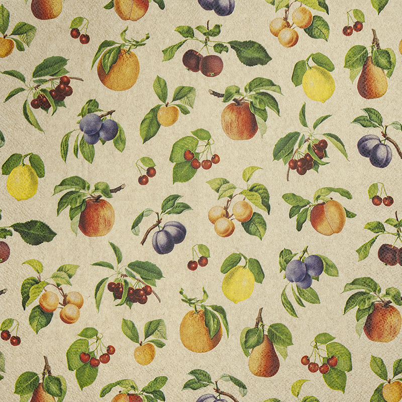 Die umweltfreundlichen „Fruit Lovers“ Servietten bieten Natürlichkeit mit stilvollem Design durch ihre bunte Obstvielfalt aus recyceltem Material.