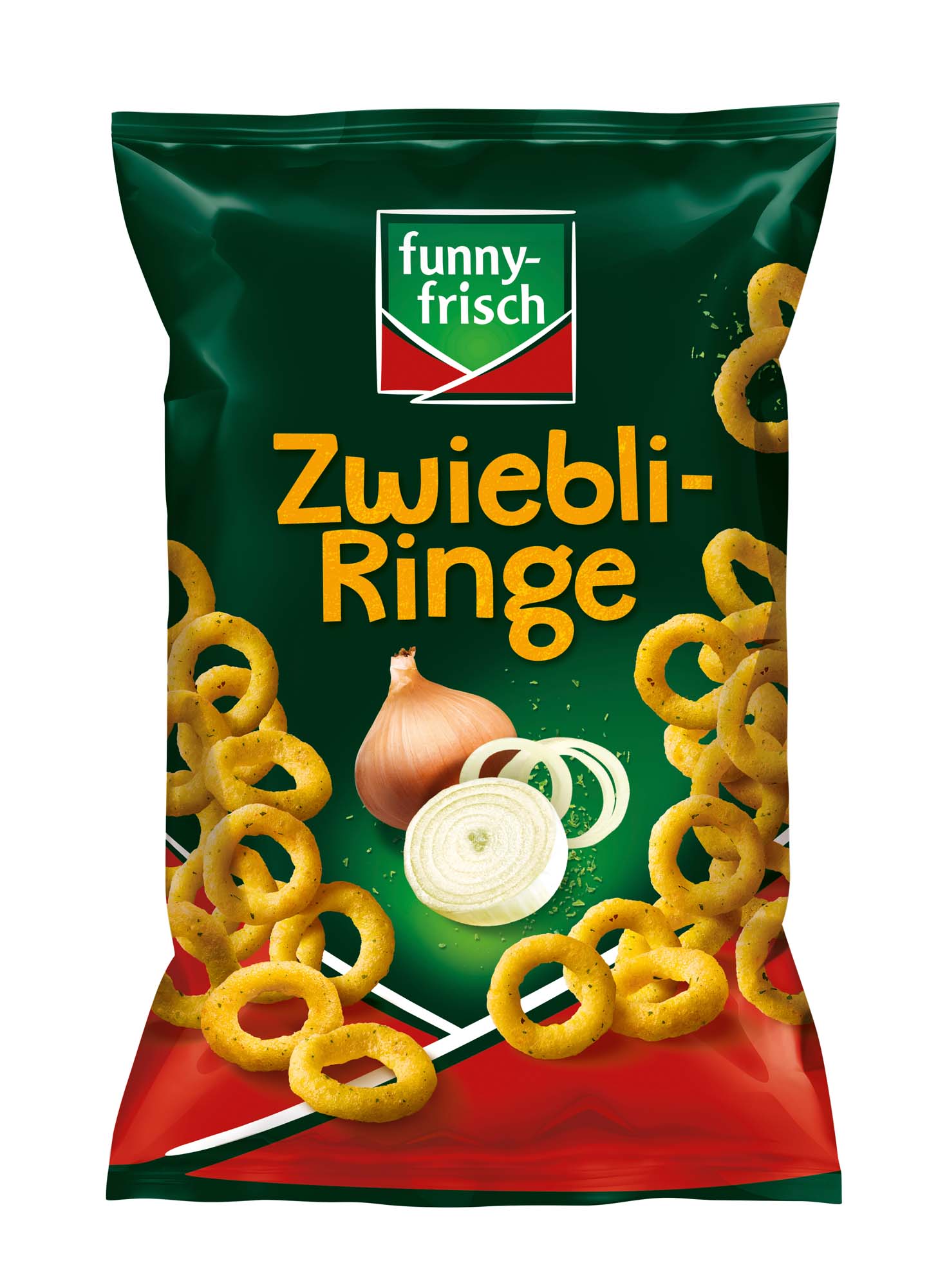 Goldgelb gebackene Maisringe mit dem herzhaften Geschmack von gerösteten Zwiebeln und feinen Kräutern – eine runde Sache, wenn es um unwiderstehlich zwiebliges Knabbervergnügen geht! funny-frisch Zwiebli-Ringe – köstlich, röstig, zwieblig!