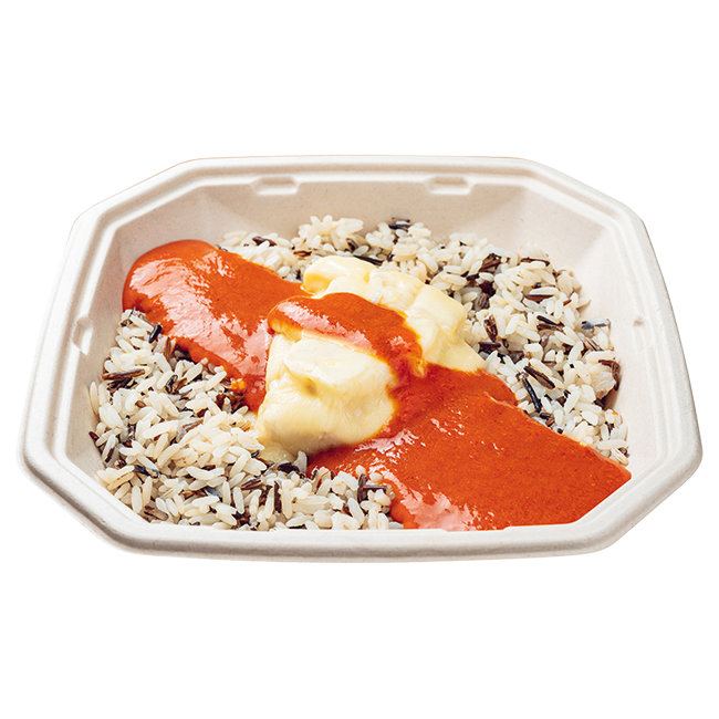 mit Ananas und Goudakäse überbacken, dazu milde Currysoße und Wildreismischung