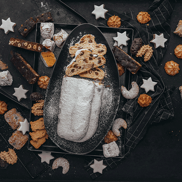 In dieser Geschenkbox: Ein Bergischer Stollen (750 g) und eine bunte Keksmischung (300 g).