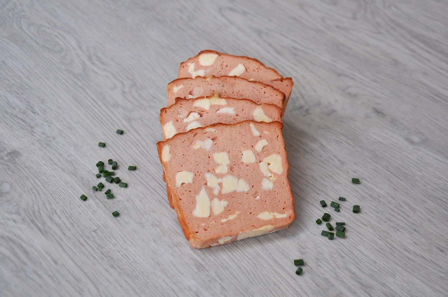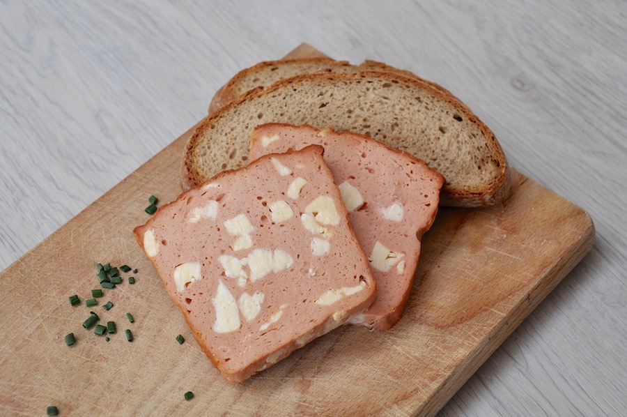 Schweinefleisch 64,5 %, Speck, Rindfleisch 15,4 %, Trinkwasser, Röstzwiebeln, Nitritpökelsalz, Stabilisator, Zuckerstoffe, Käse (Milch), Gewürze, Senf und Sellerie, Antioxidationsmittel, Ascorbinsäure, Geschmacksverstärker, Phosphat.