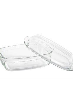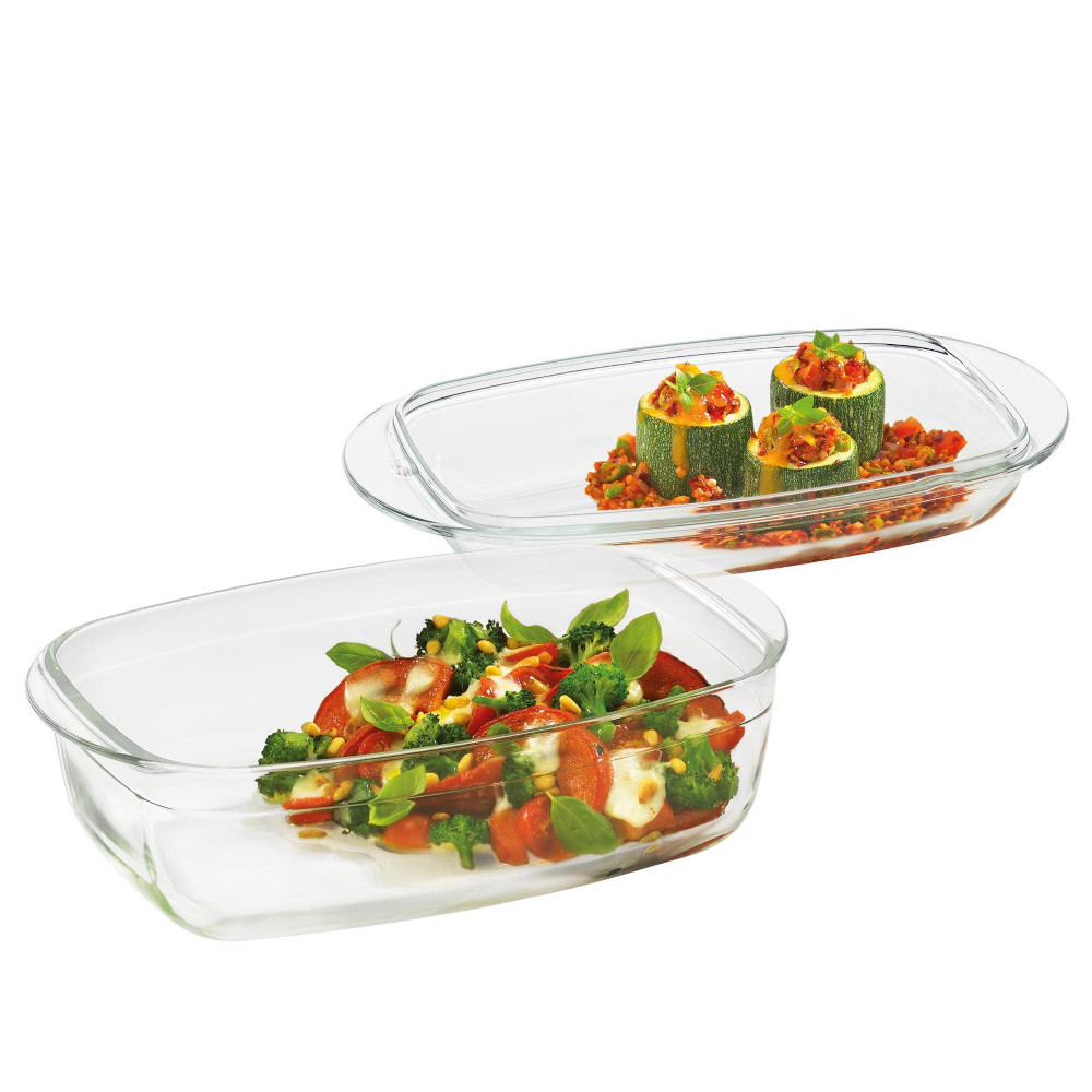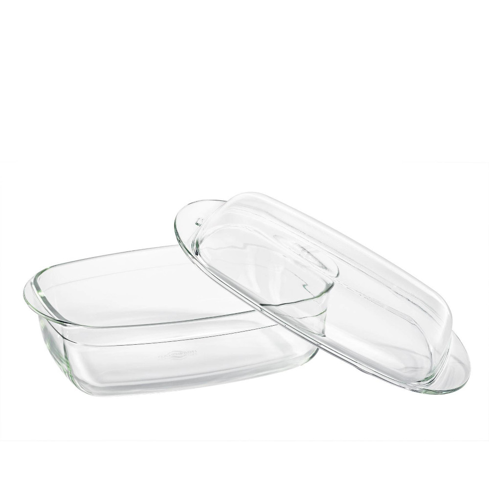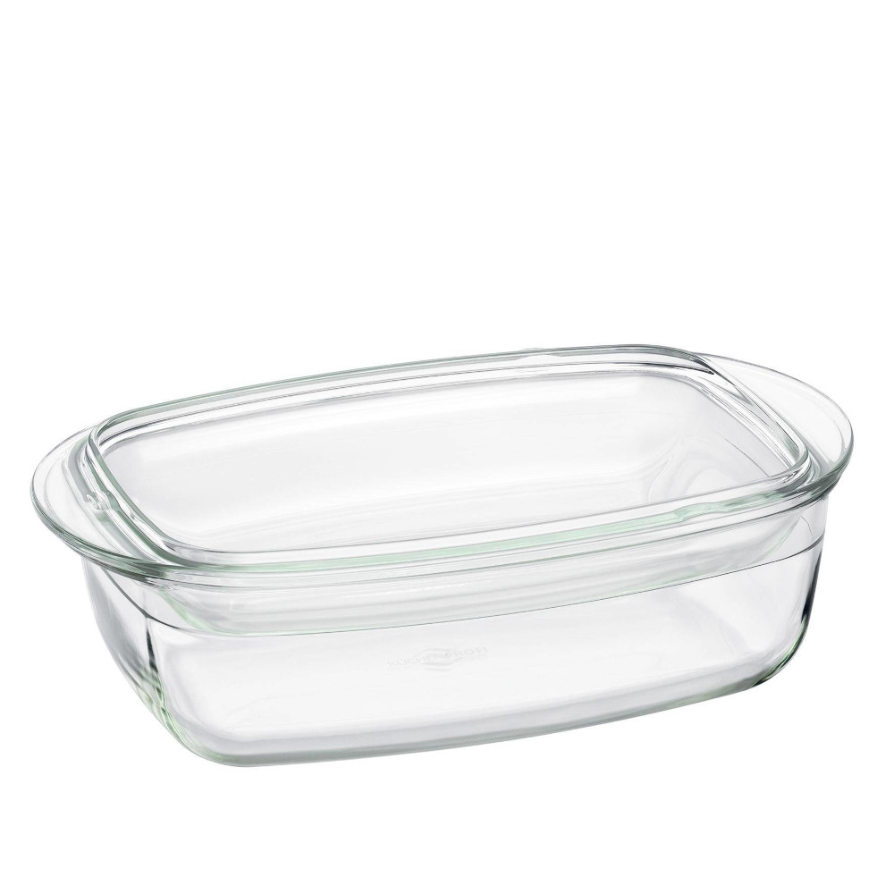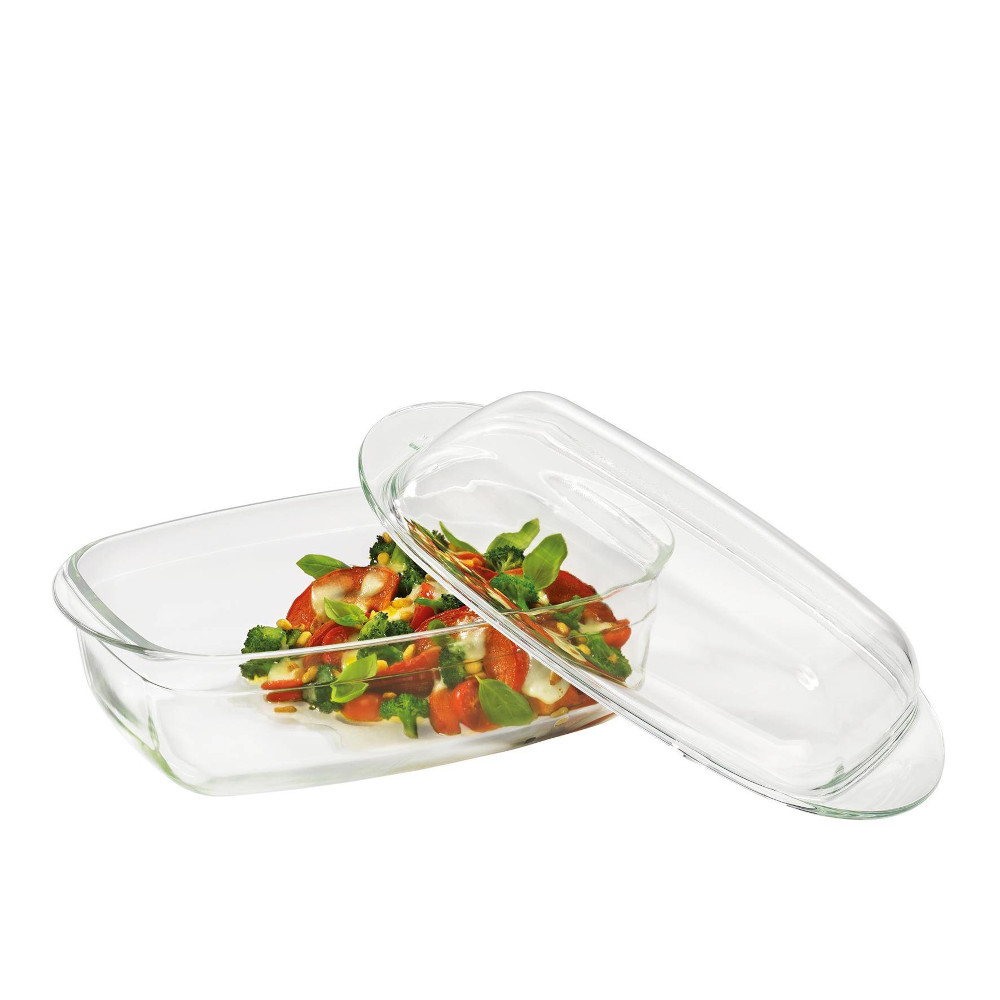 Elegante Ofen – und Auflaufform aus klarem Borosilikatglas. Der Deckel ist auch einzeln als Schale oder Auflaufform nutzbar.
