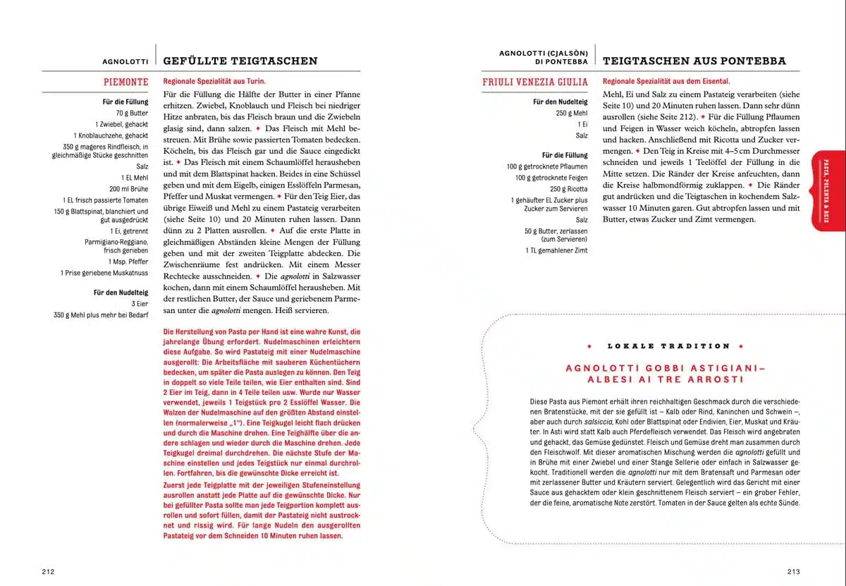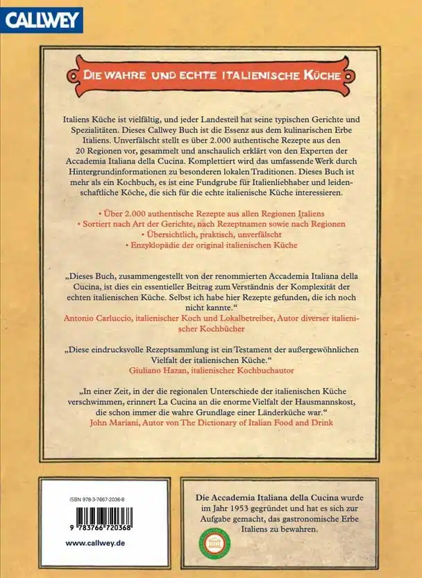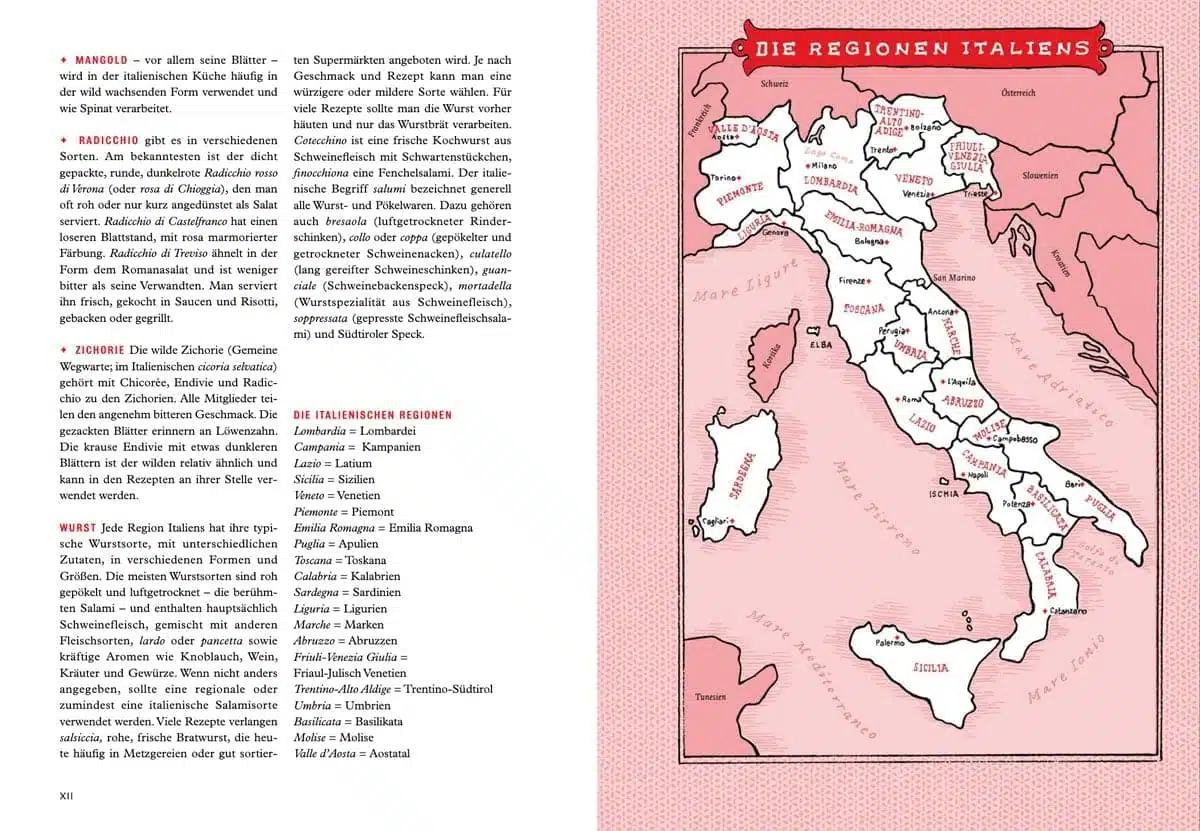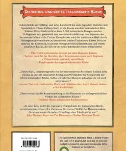 Verlagstext: Dieses Buch ist eine Entdeckungsreise durch die 20 regionalen Küchen Italiens, denn es versammelt über 2.000 authentische Rezepte. Jeder Landesteil hat seine typischen Gerichte und man erfährt, dass bekannte Pasta Gerichte im Norden völlig anders zubereitet werden als im Süden. Das Buch ist eine Fundgrube für jeden Koch und jeden Italienliebhaber. Komplettiert wird das knapp tausend Seiten starke Werk durch kurze Zusatzinformationen, woher genau die Gerichte stammen, wann sie in Italien üblicherweise serviert werden und wozu sie am besten passen.