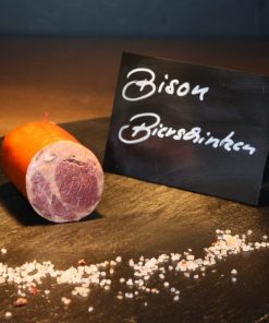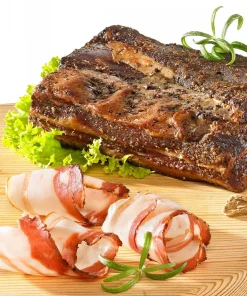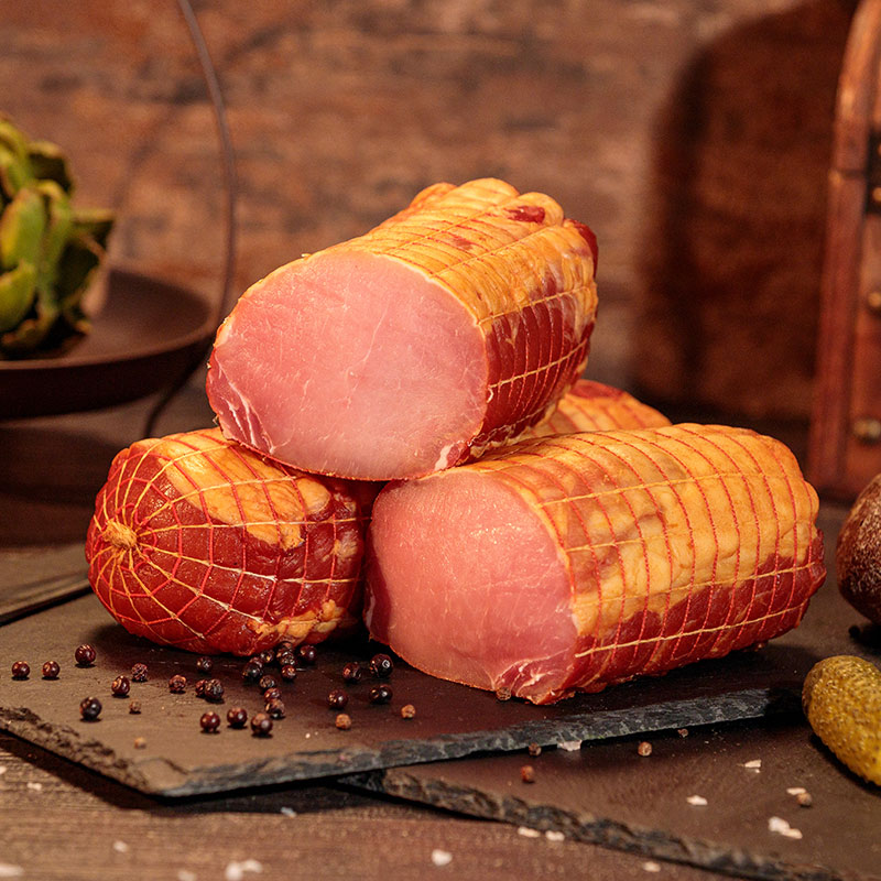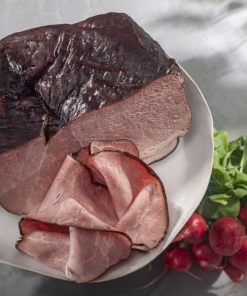 Der Lachsschinken ist ein sehr zarter fettarmer Schinken vom Rückenstrang des Schweins. In dünne Scheiben geschnitten ist er ein wahrer Hochgenuß.