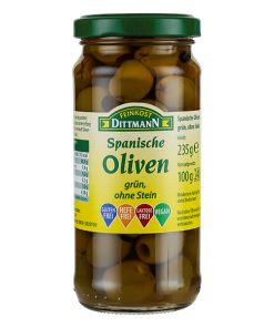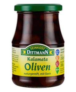 Schwarze Oliven (entsteint)** (68 %), natives Olivenöl extra** (31 %), Steinsalz, Zitronensaft**
