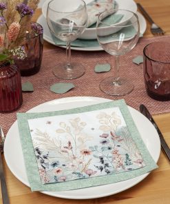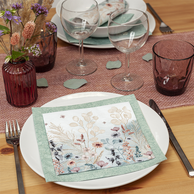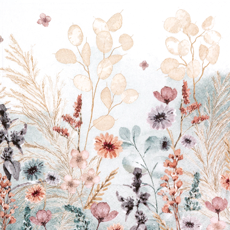 Mellow Flowers natural – Elegante und natürliche 3-lagige Servietten (33 cm x 33 cm) mit floralen Mustern für stilvolle Tischdekorationen.
