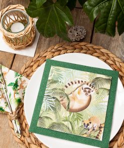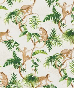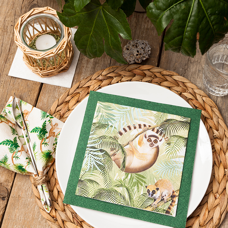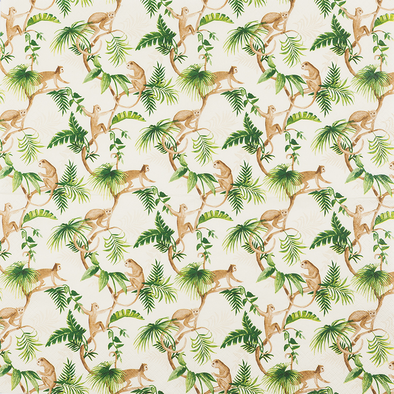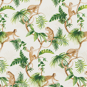 Die ‚Monkey Family‘ Serviettensammlung bietet eine charmante exotische Note mit dreilagigem Tissue in Creme und Grün, perfekt für stilvolle Dekorationen.