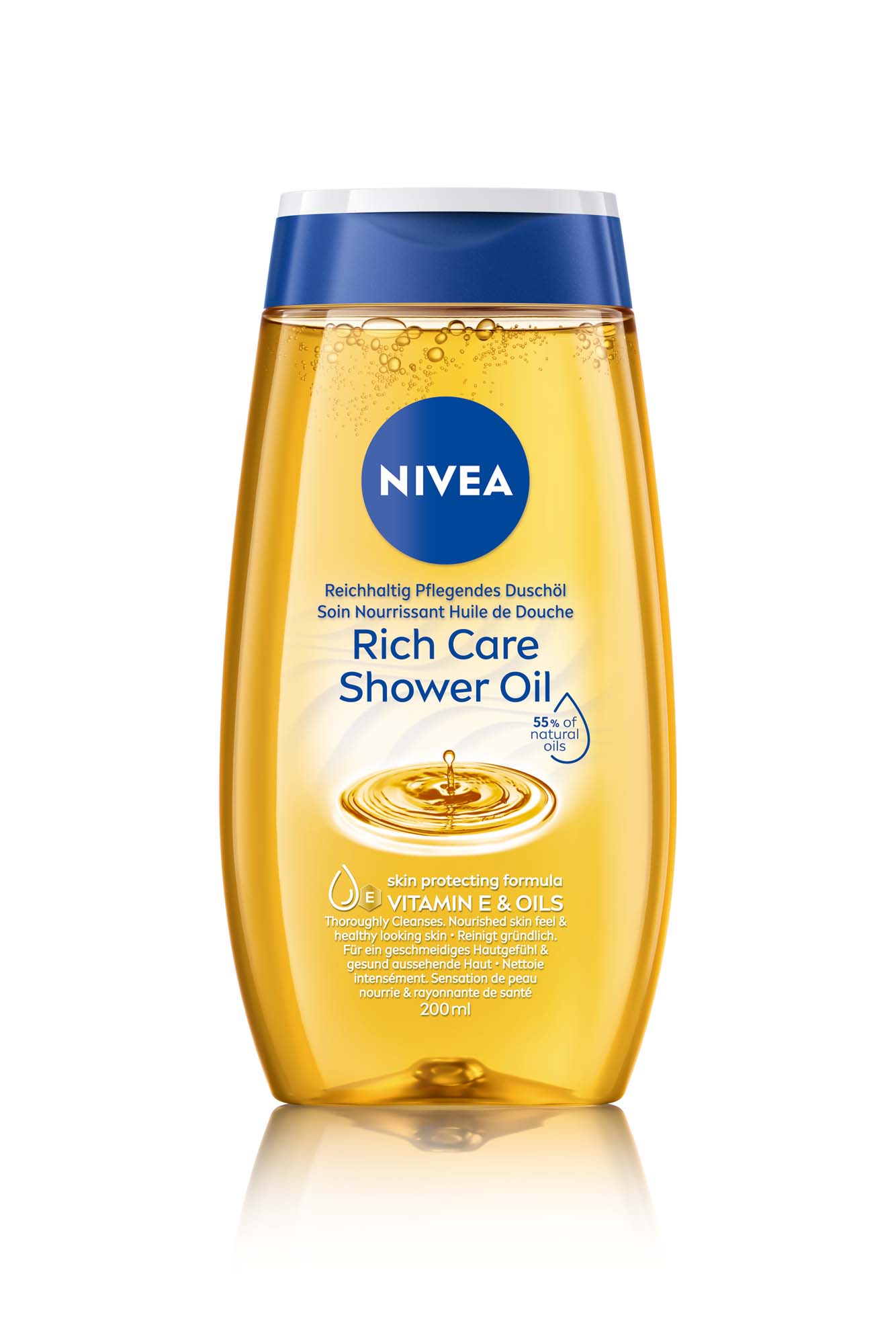 Spüren Sie, wie das verwöhnende Duschöl mit 55% natürlichen Ölen Ihre Haut sanft pflegt: Reichhaltig Pflegendes Duschöl.