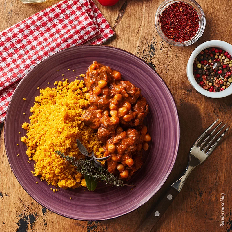 Der Löwenanteil unserer Kombination aus saftigem Rindfleisch und leckerem Couscous ist das zarte Fleisch. Abgerundet mit frischen Zutaten wie Zwiebeln, Tomaten und Kichererbsen. Der Joghurt-, Speisequark- und FrischkäseDip sorgt für eine cremige Konsistenz, während Gewürze wie Ingwer, Chilischoten und Sellerie für zusätzlichen Geschmack sorgen. Das natives Olivenöl und Rapsöl geben dem Gericht eine feine Note und runden den Geschmack ab.