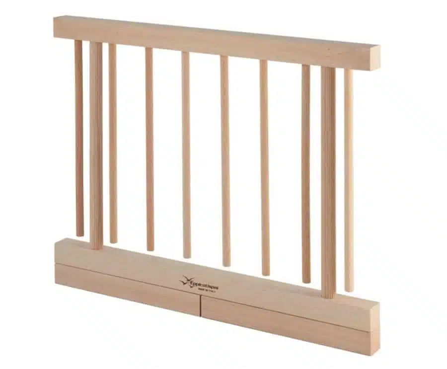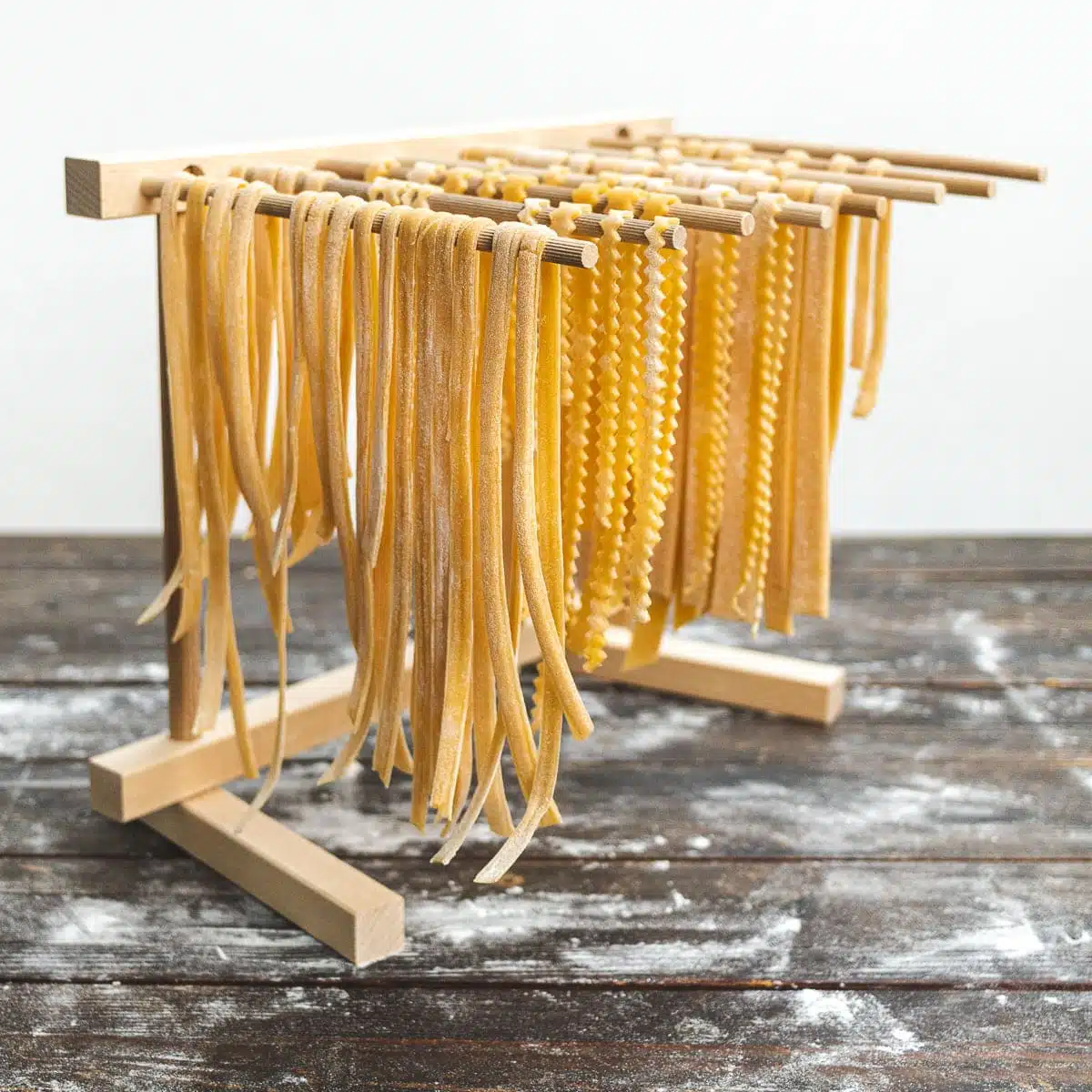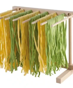 Der 8-armige Holzständer aus naturbelassenem Buchenholz ist ideal zum Trocknen langer Nudeln wie z.B. Spaghetti, Tagliatelle oder Tagliolini. Der Ständer besteht aus 2 Teilen und ist schnell zusammengebaut. Wenn er nicht benötigt wird, kann er ganz einfach platzsparend auseinander genommen und flach in einer Schublade verstaut werden.
