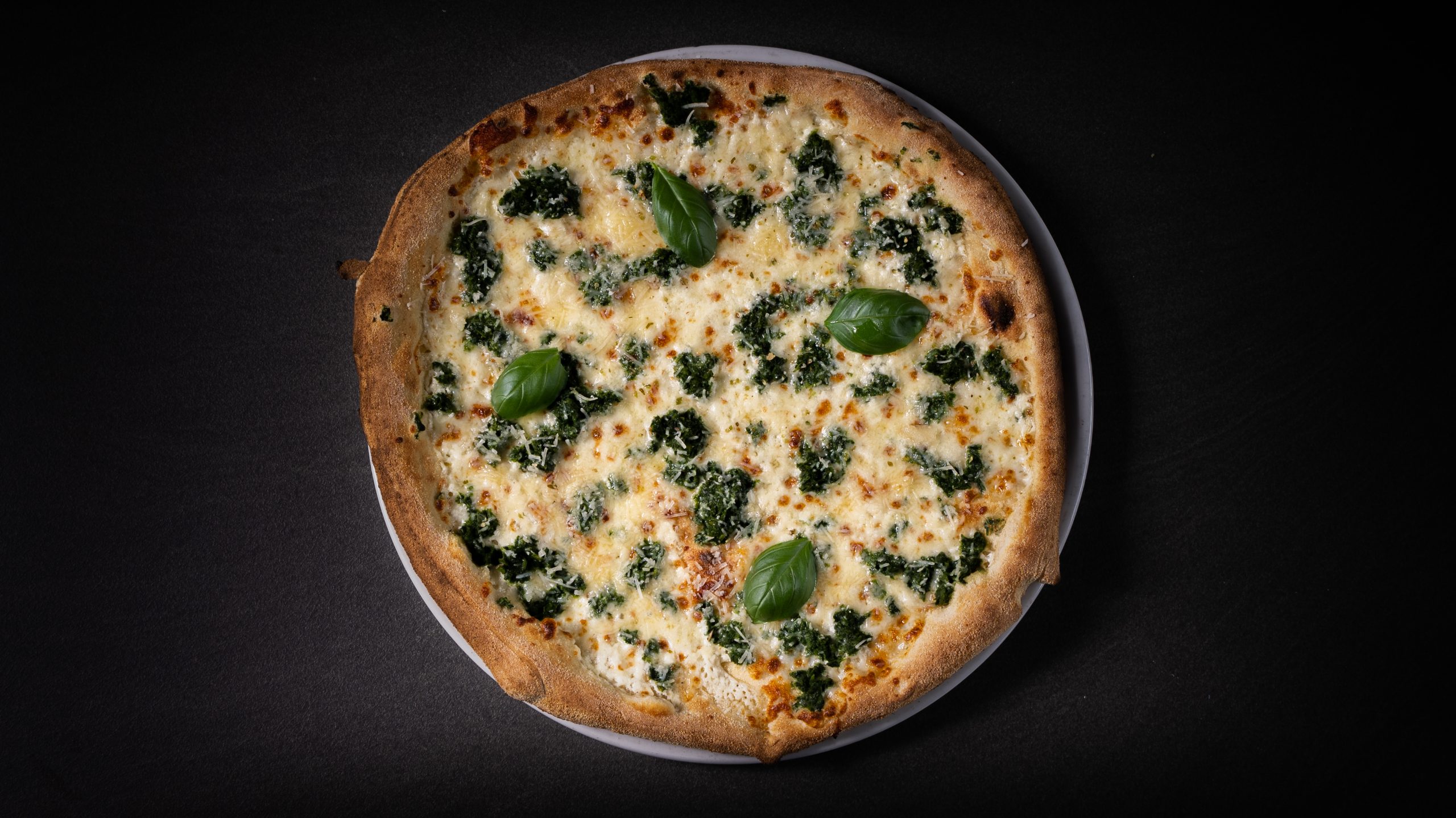 Bio-Dinkelteig , mit Creme fraiche, Spinat, Parmesan und Knoblauch, ohne Tomatensauce, Basilikum, Oregano