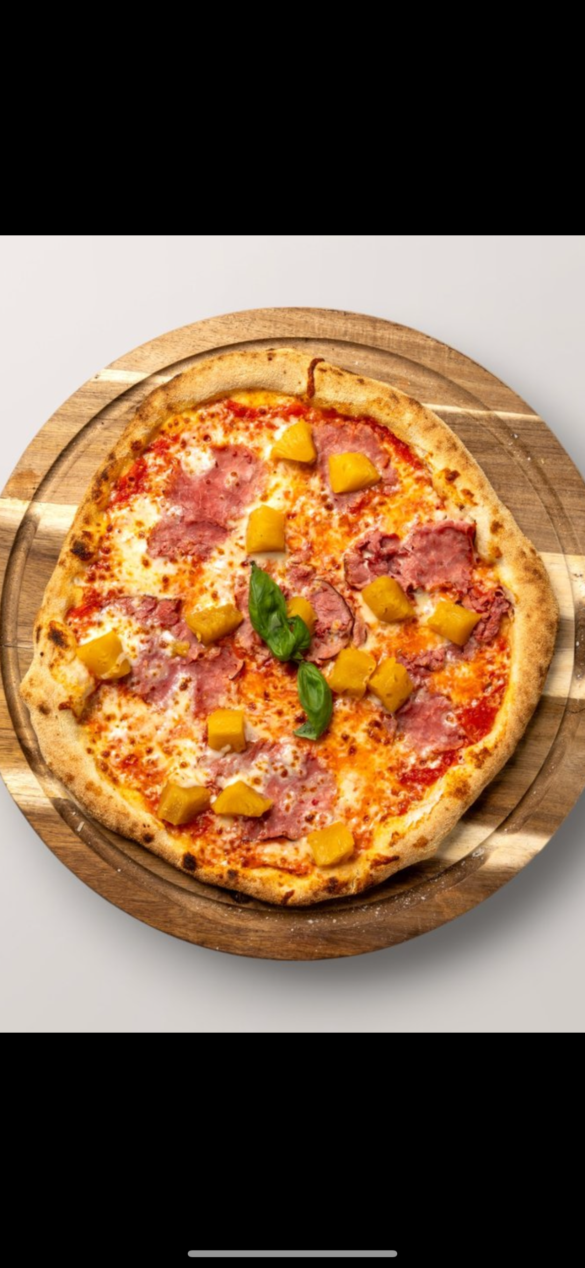 Bio-Dinkelteig, Bio-Tomatensosse, Mozzarella, Rinderschinken , Ananas , Basilikum, Oregano