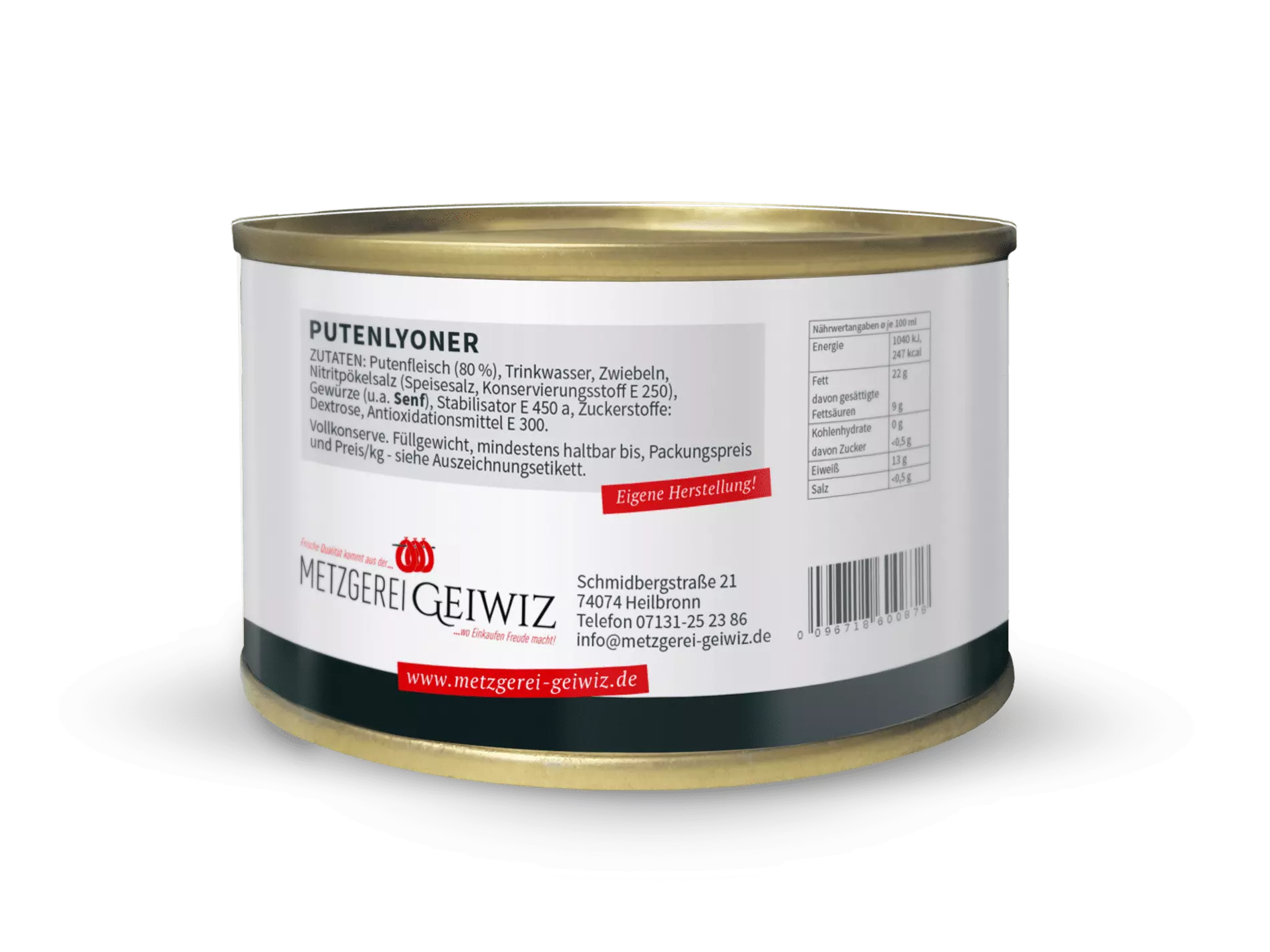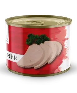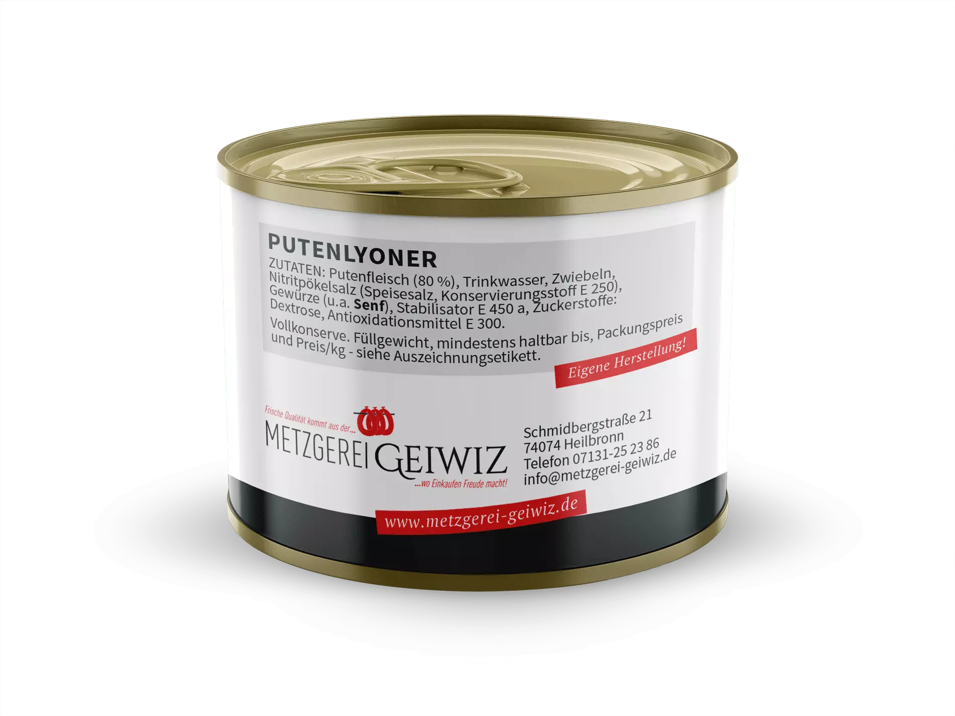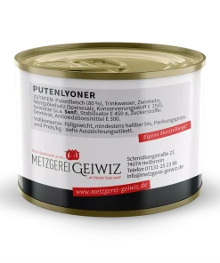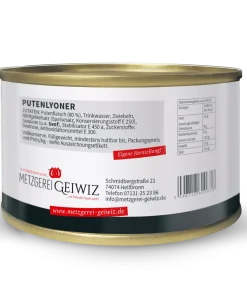 ZUTATEN: Putenfleisch (80 %), Trinkwasser, Zwiebeln, Nitritpökelsalz (Speisesalz, Konservierungsstoff E 250), Gewürze (u.a. Senf), Stabilisator E 450 a, Zuckerstoffe: Dextrose, Antioxidationsmittel E 300