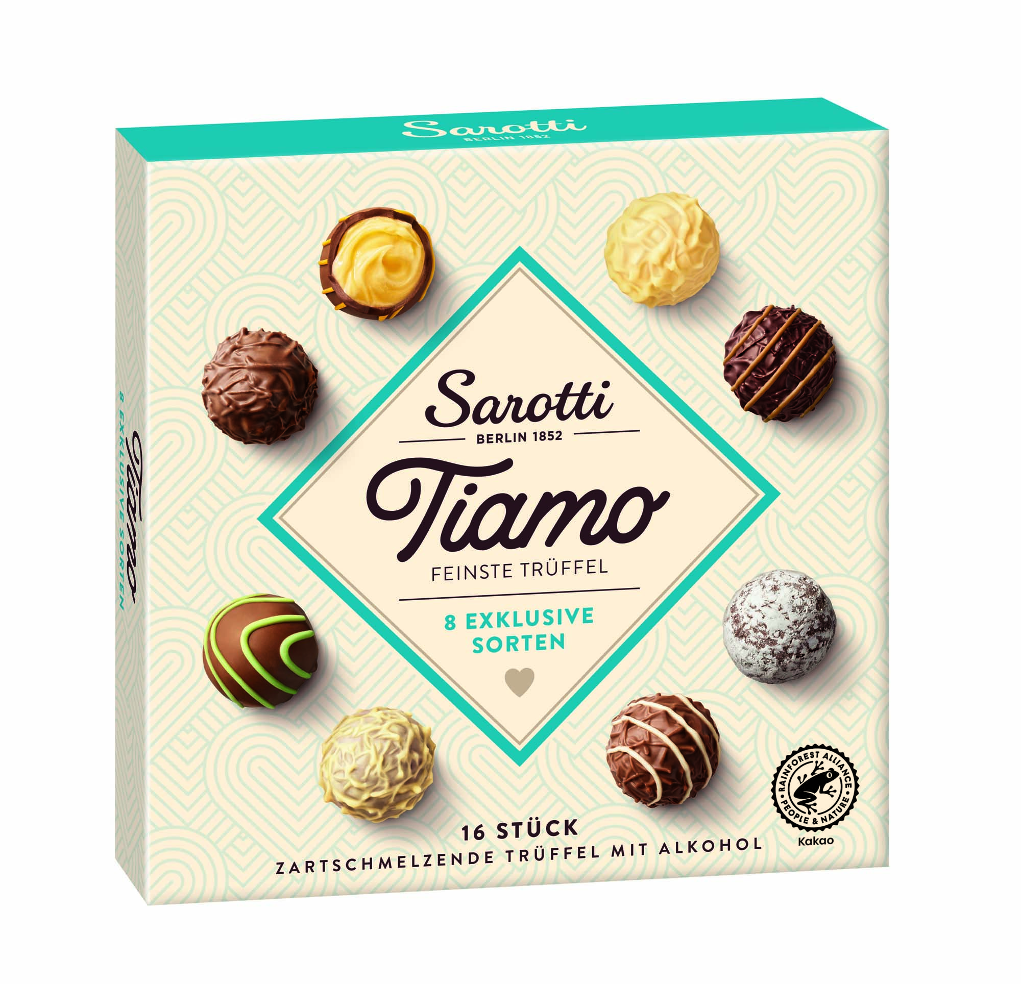 Unsere Tiamo-Geschenkpackung ist wie eine große Liebeserklärung an anspruchsvolle Gaumen. Die feinen Trüffel mit Marc de Champagne, Jamaika-Rum, feiner Vanille und edler Schokolade kommen bei jedem Anlass gut an!