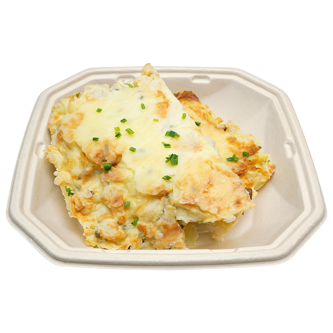 mit Kartoffeln, frischem Schnittlauch und Goudakäse überbacken