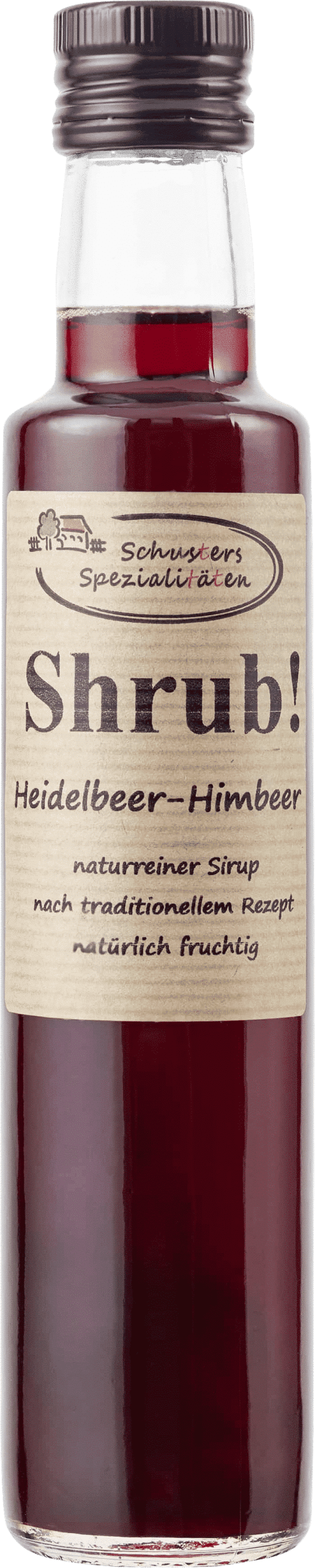 Shrub! Heidelbeer-Himbeer besteht aus aromatischen Himbeeren und Heidelbeeren aus eigenem Anbau, kombiniert mit Bio-Apfelessig und Zucker.