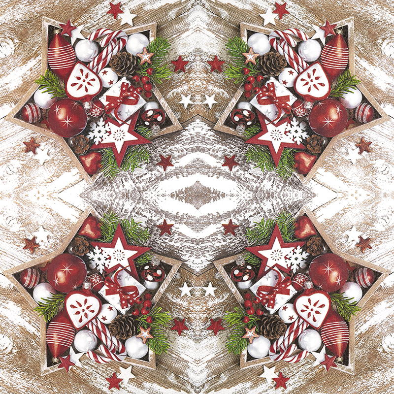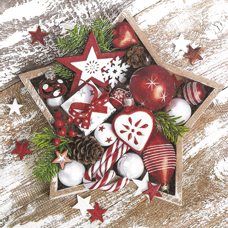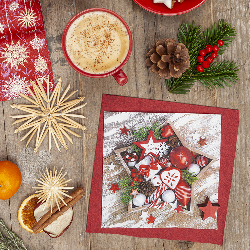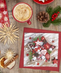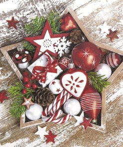 Die ‚Star Arrangement‘ Servietten bieten eine festliche Dekoration mit ihrem rustikalen Holzstern und klassischen Weihnachtsaccessoires. Perfekt für stimmungsvolle Tischdekorationen.