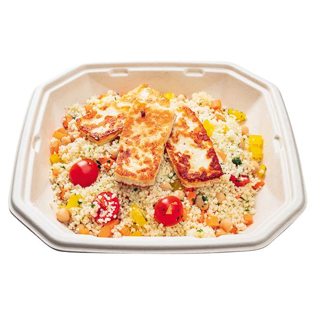 mit Möhre, gelber Paprika, Kichererbsen und Kirschtomaten, dazu gebratener Halloumi-Käse