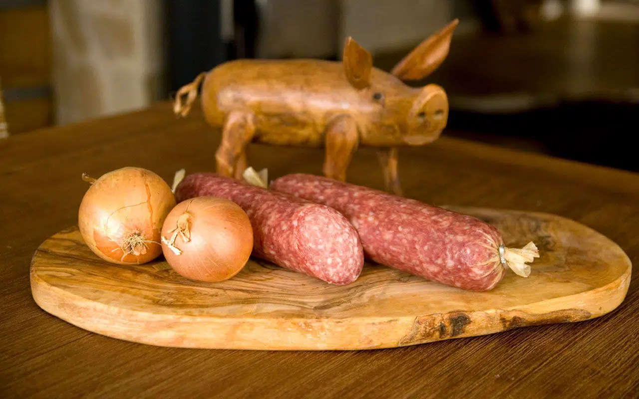 Durch Zugabe von frischen, fein gehackten Zwiebeln erhält diese Wurst ihre ganz spezielle Würzung.