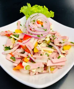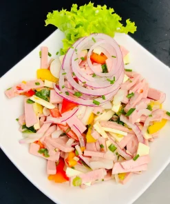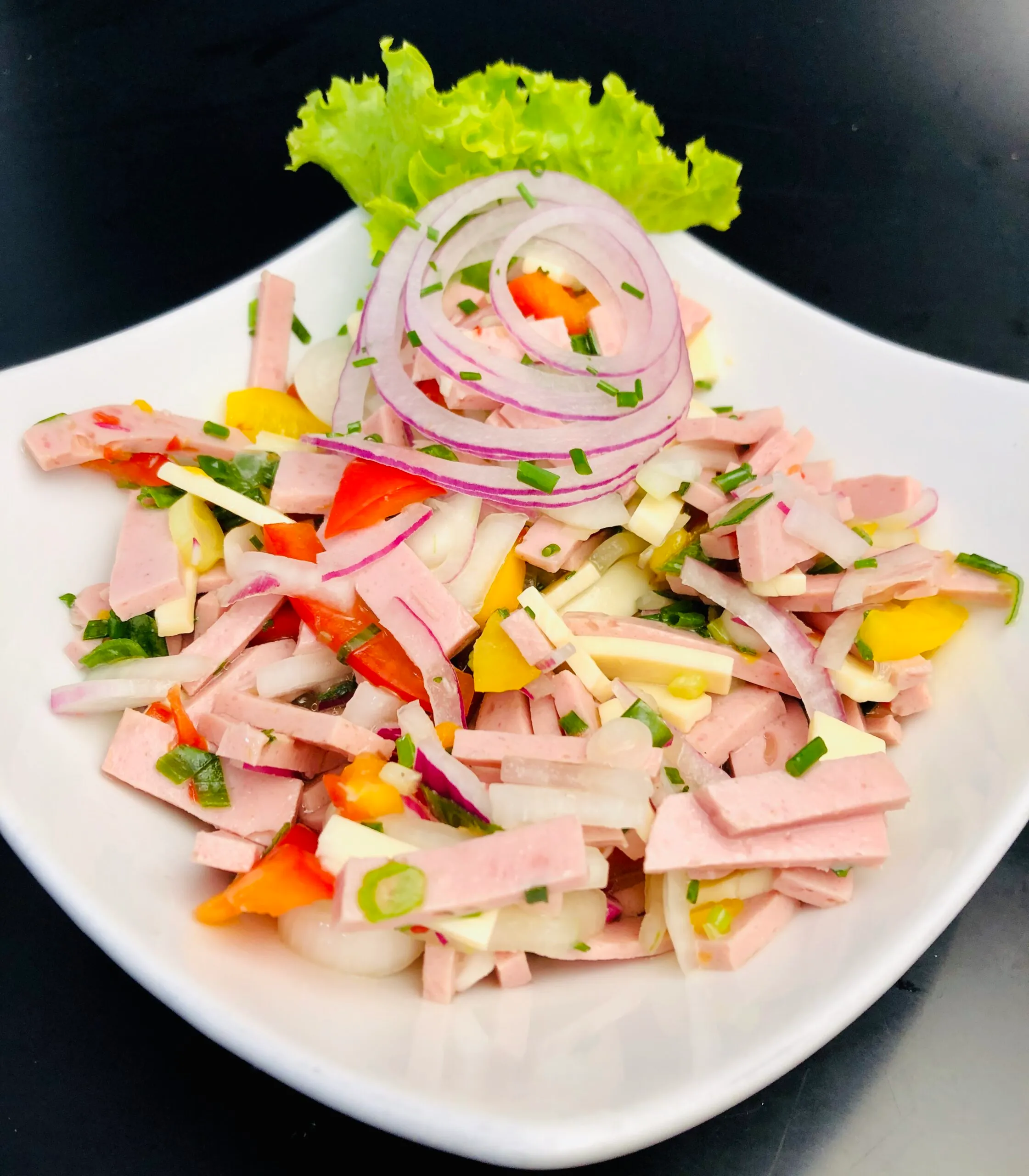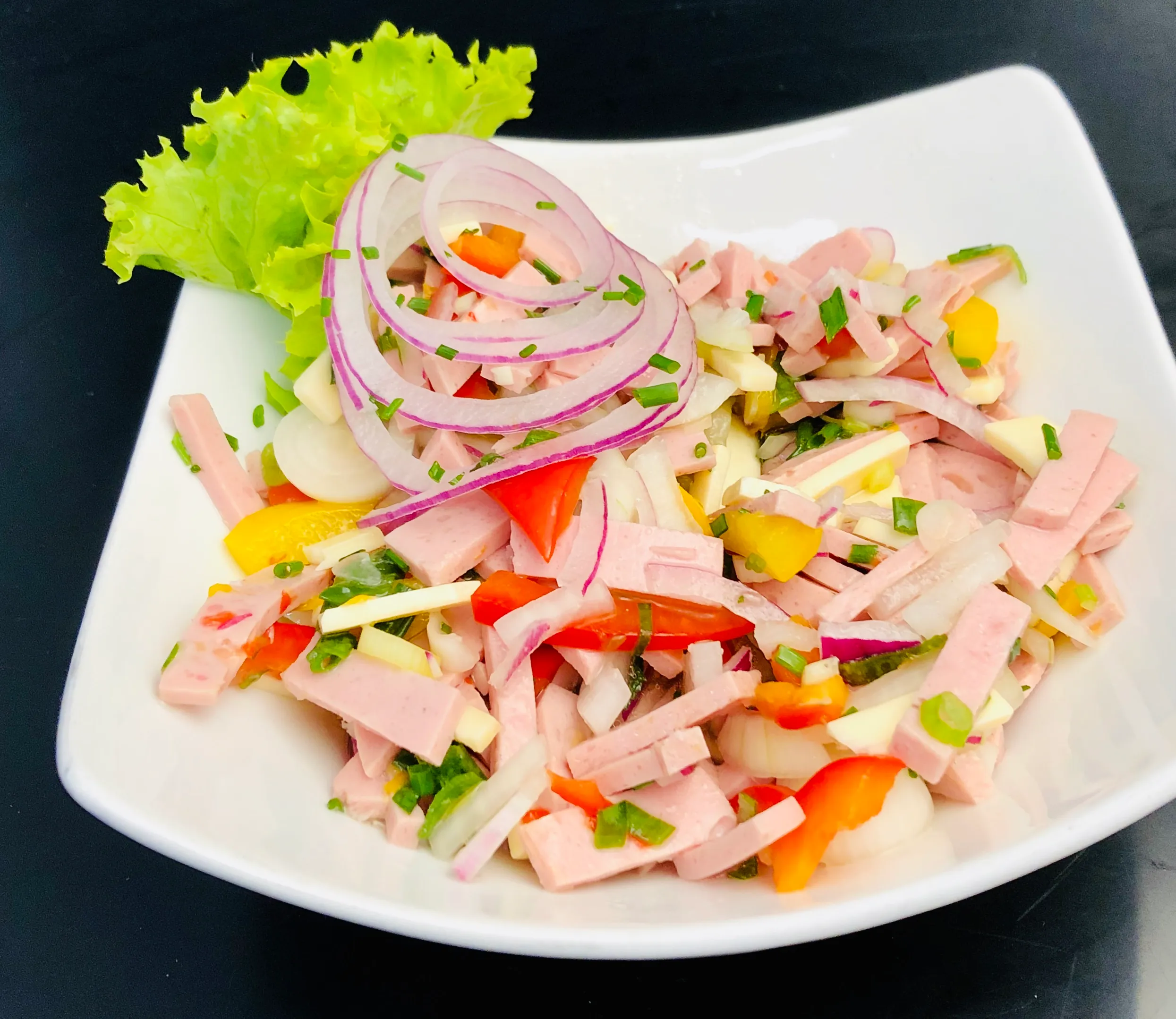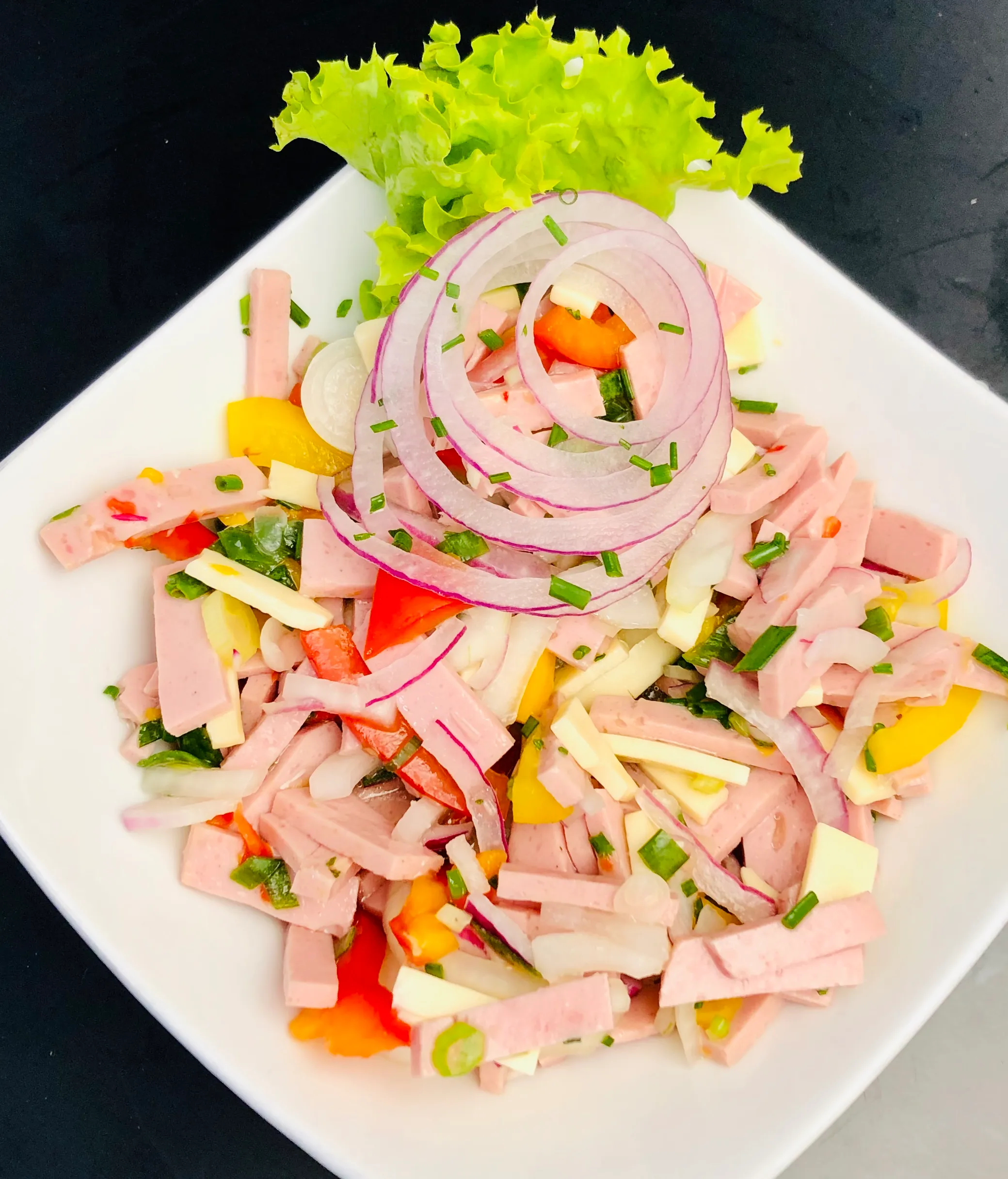 Wir schneiden Schinkenwurst, Allgäuer Emmentaler und Paprika in dünne Streifen, dazu geben wir dann Essiggurken und Zwiebelringe. Gewürzt wird ganz klassisch mit einer Marinade aus Weißweinessig, Zucker, Salz und Pfeffer.